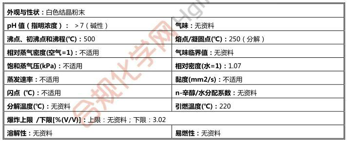 固體。會(huì)跟水激烈反應(yīng), 生成高度易燃的氣體。吞食后有毒。會(huì)引起皮膚燒傷,有嚴(yán)重?fù)p害眼睛的危險(xiǎn)。有嚴(yán)重?fù)p害眼睛的危險(xiǎn)。